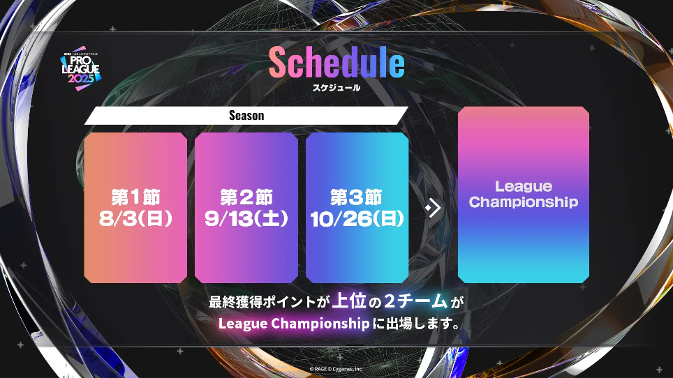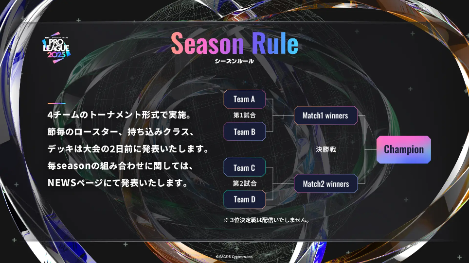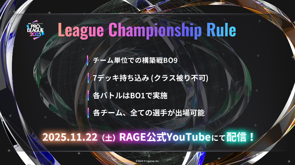 本リーグ最終決戦である「RAGE Shadowverse Pro League 2025 Championship」を、2025年11月22日(土)に開催いたします。総合・プロ両部門上位2チームにより、年間王者および世界大会への出場権1枠を懸けて火花を散らす大一番となります。配信情報・視聴方法等の詳細は公式サイトおよび公式SNSにて近日発表予定です。