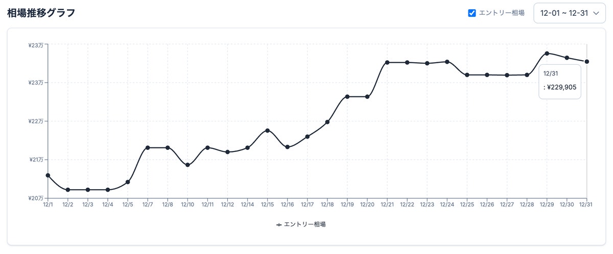 今回のレポートは、この「ゲーミングPC相場チェックツール」をもとに作成しています。2025年12月は、世界的なメモリ供給不足および価格高騰を背景に、各社BTOメーカーで在庫逼迫や価格改定が相次ぎました。これにより、エントリー・ミドル・ハイエンドの全性能帯において、ゲーミングPCの相場価格が大きく上昇しています。