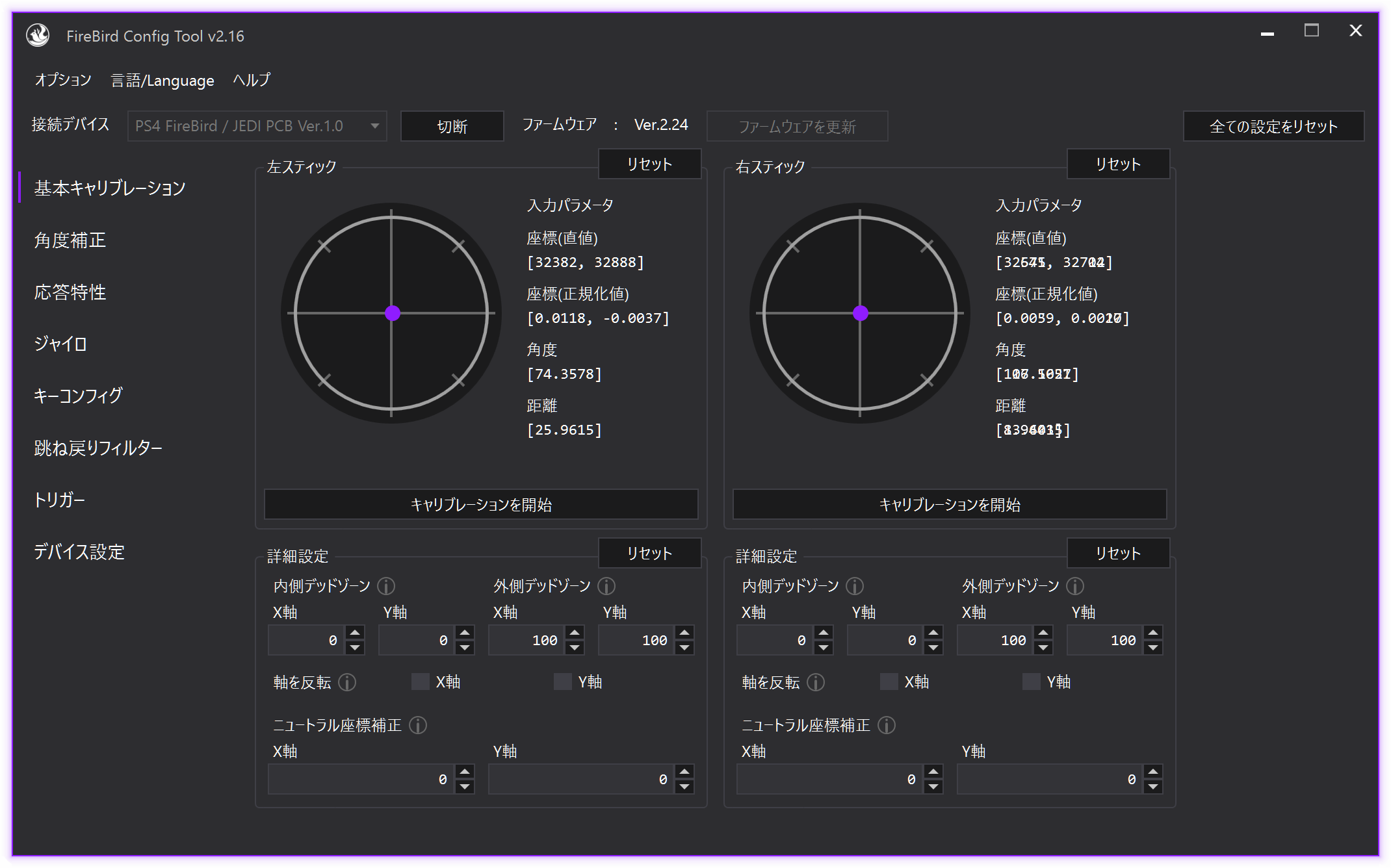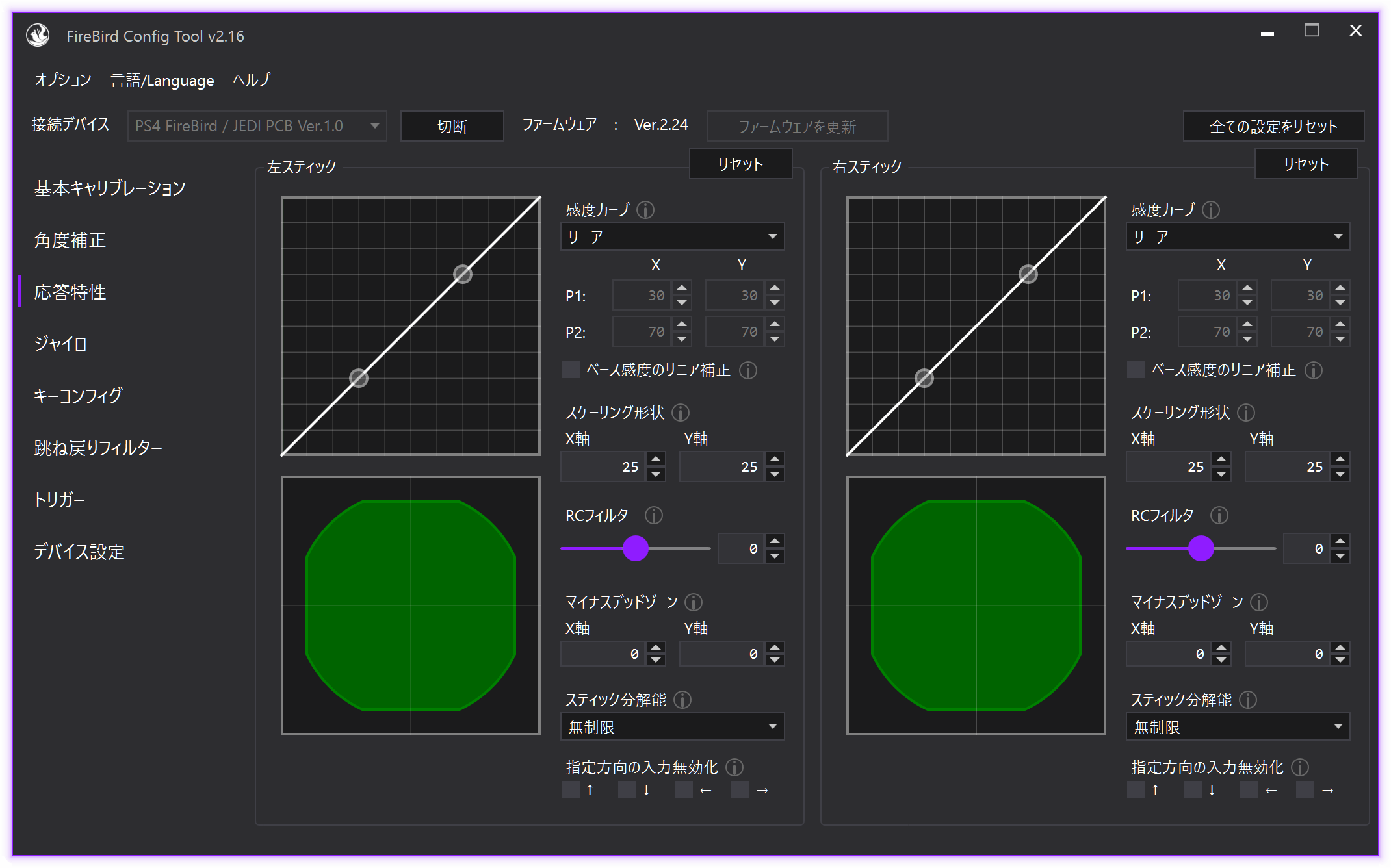 従来の磁気スティックは初速の遅さが弱点でした。スムージング補正を弱めて対処する製品もありましたが、ジッターが発生するトレードオフは避けられませんでした。FireBirdは独自の技術でこの課題を解決。「RCフィルター」をマイナス値にすることで、耐久性・カスタマイズ性に優れながら、アナログスティックに匹敵する操作感を実現しています。