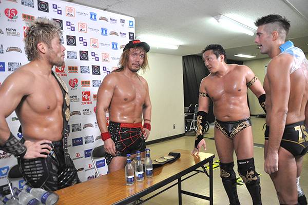 試合後のバックステージ、内藤&SANADAの前に、タイチ&ザックが登場して、リマッチを要求。たがいに好きなことを言い合った末に、最後は新王者組に7.25東京ドームでの再戦を認めさせた格好となった。