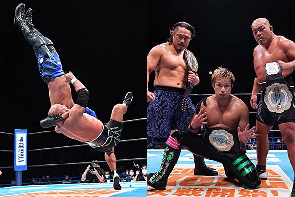 第2試合は9.4メットライフドームで「KOPW 2021」争奪戦を行なう挑戦者の矢野通と保持者のチェーズ・オーエンズが、それぞれロビー・イーグルス&タイガーマスク、石森太二&エル・ファンタズモとトリオを結成して前哨戦。矢野とオーエンズは化かし合いのような攻防を繰り広げ、頭脳を競う場面も。オーエンズはタイガーをパッケージドライバーで仕留めると、試合後にテキサスストラップで矢野を蹂躙した。
