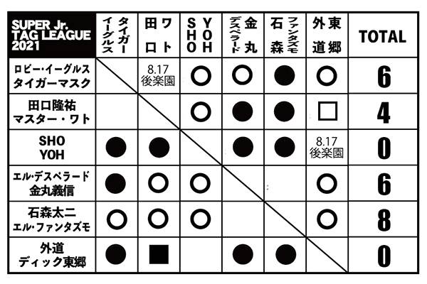 8.7後楽園から激闘が繰り広げられた『SUPER Jr. TAG LEAGUE 2021』も、公式戦は残り二つ。現時点ではロビー・イーグルス&タイガーマスク組と石森太二&エルファンタズモ組が全勝で首位を併走。そのあとをエル・デスペラード&金丸義信組が2勝1敗で追いかける展開に。
