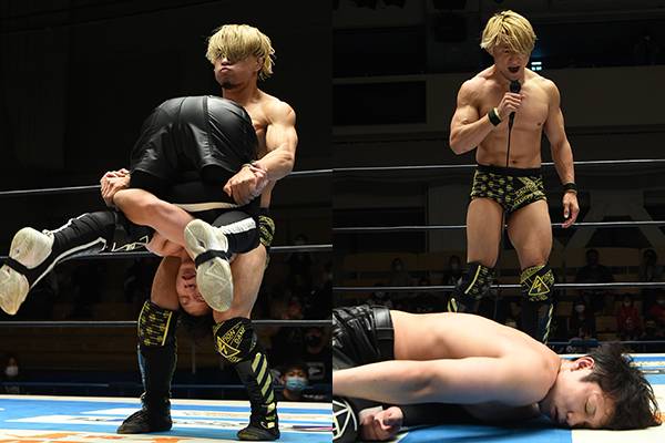 メイン(第5試合)は『SJTL 2021』公式戦、SHO&YOH(0勝3敗)とデスペラード&金丸組(2勝1敗)による因縁の対決。スランプに陥っているSHO&YOHは、それを吹っ切るように奇襲攻撃を仕掛ける。だが、デスペラード&金丸組はラフファイトとインサイドワークで巻き返し、YOHのウィークポイントである左足に集中攻撃。SHO&YOHは必死に反撃するも、終盤に連携攻撃に失敗。その後、SHOは劣勢のYOHを救出せず、最後はデスペラードがピンチェ・ロコでピンフォール勝ち。
