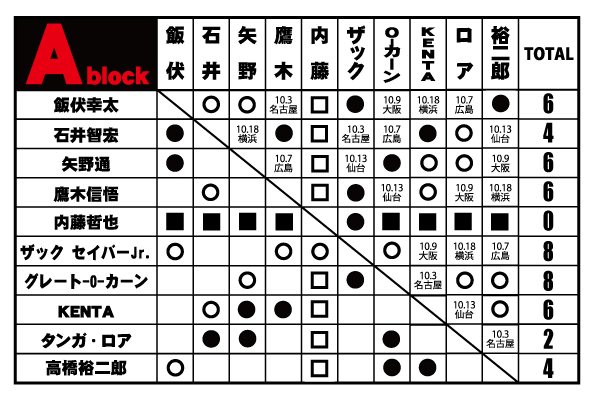 試合後、鷹木は10.3愛知で対戦する飯伏幸太に対し、「俺はオマエのリハビリに付き合うつもりはねえからな。一気に勝って、決勝に向けて前進するのみだ!」と宣戦布告した。