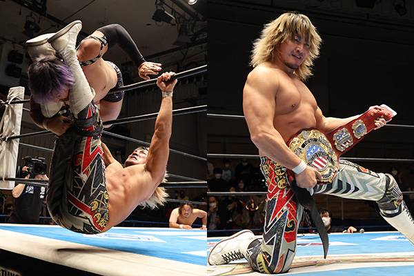 試合後、棚橋はKENTAに奪われていたUSヘビーのベルトを回収。そしてファンに感謝のメッセージを贈ると、最後はエアギターからの「愛してま~す!」で大会を締めくくった。