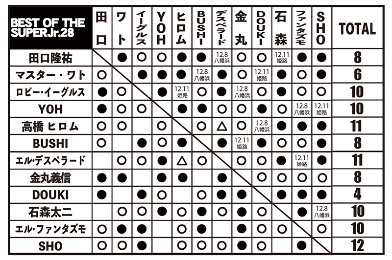 この結果、変わらずSHOが12点で単独首位をキープするも、一点差でデスペラードとヒロムが猛追する展開に。