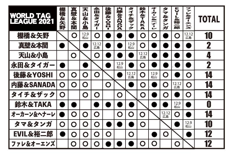 12月7日(火)、岡山・ジップアリーナ岡山で『WORLD TAG LEAGUE 2021 & BEST OF THE SUPER Jr.28』第18戦が開催された。今大会では『WTL』の公式戦の9回戦(全11戦中)が行なわれた。現在は5チームが6勝2敗で並ぶ混戦状態。