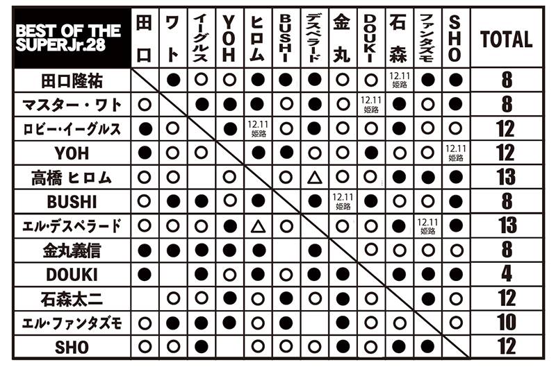 この結果、ヒロムとデスペラードの二人が勝ち点13で首位タイに浮上。星を伸ばせなかったSHO、そしてこの日勝ち星を上げた石森、YOH、ロビーの3人が勝ち点12で並んだ状況となった。