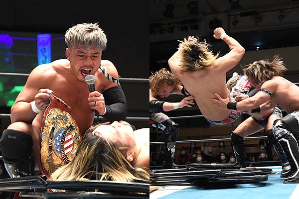 試合後、BULLET CLUBは棚橋に対し、リングに積んだイスの山に向けて3人がかりのパワーボムを敢行。そしてKENTAはKO状態の棚橋に向け「オマエからはこのベルトに対する愛が、一つも感じねえんだよ。あんだけ普段、愛叫んでるクセにな」とUSヘビーを手に挑発した。