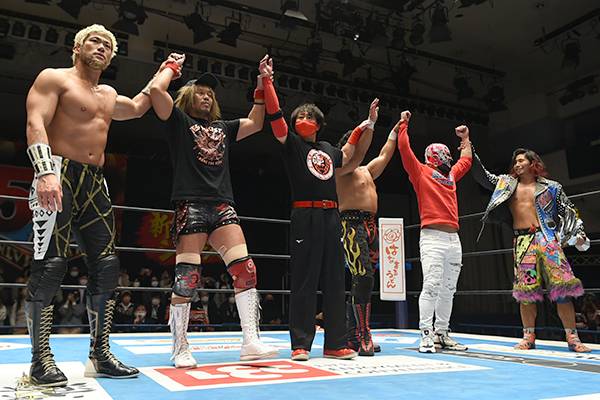 メイン(第7試合)はイリミネーションマッチ、オカダ・カズチカ&棚橋弘至&真壁刀義&小島聡vs内藤哲也&SANADA&鷹木信悟&高橋ヒロム。2.20札幌でのIWGP世界ヘビー級王座戦で雌雄を決する王者オカダと挑戦者・内藤、2.19札幌でIWGP USヘビー級王座戦を行なう王者・棚橋とSANADAのマッチアップを軸に、試合は序盤から白熱の攻防に。だが、次第にL・I・Jが抜群の連携でペースを握り、まずは真壁を失格に追いやる。その後、SANADAが棚橋、内藤がオカダを排除し、残すは小島一人に。孤軍奮闘する小島だったが、L・I・Jは4人がかりで攻め込み、最後は内藤がデスティーノで撃沈。なんとL・I・Jが4人残りのパーフェクト勝利を収めた。