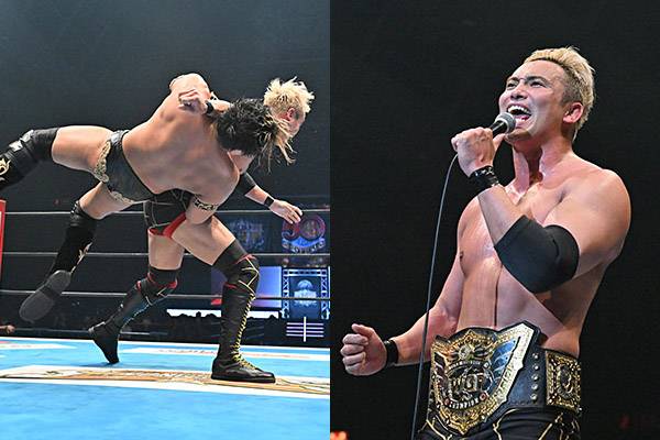 メイン(第8試合)は『NEW JAPAN CUP』3回戦として、IWGP世界ヘビー級王者のオカダ・カズチカとタイチが激突。“横綱”オカダに対し、タイチは鋭いキックを軸に攻め立てる。オカダも貫禄のファイトを見せるが、タイチは一歩もひるまず応戦。終盤、タイチはオカダのドロップキックを喉輪落としで切り返すと、タイチ式ラストライド、さらに横綱式カチ上げエルボーを炸裂。だが、奥の手である雪崩式ブラックメフィストを回避したオカダは、相手のお株を奪うようにシットダウン式ラストライドを敢行。そしてオカダはドロップキックからの開脚式ツームストンパイルドライバーでタイチの動きを止めると、最後はレインメーカーで激闘に終止符。