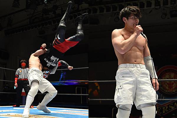 セミ(第6試合)は4.25広島の「KOPW 2022」争奪戦の前哨戦として、保持者のタイチがTAKAみちのく、挑戦者の鷹木信悟が高橋ヒロムを伴い対決。タイチと鷹木は開始と同時に争奪戦のルールを巡り口論。そして激しいつばぜり合いを見せる。ヒロムがTAKAを名も無きヒロムロールで下したあとも、タイチと鷹木は口争いを展開。争奪戦のルールの行方に、ますます注目が集まる。