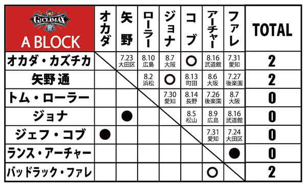 セミファイナル(第8試合)はAブロック公式戦、AEWから『G1』に殴り込みをかけたランス・アーチャーが、バッドラック・ファレと対決。2m級モンスターと160kgの怪物の対決は、序盤からド迫力の肉弾戦に。終盤、アーチャーはエプロンから驚愕のトペ・コンヒーロを炸裂。だが、場外カウントが進む中、ファレはエプロンでアーチャーに不完全ながらもグラネードを食らわせて場外に突き落とし、まんまとリングアウト勝ちを収めた。