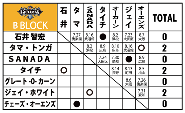 第7試合はBブロック公式戦で、タマ・トンガとチェーズ・オーエンズが対峙。G・O・DのBULLET CLUB追放の遺恨を引きずる両者は、開始と同時に憎しみをぶつけ合う。試合が佳境に入ると、オーエンズは場外マットを外し危険な攻撃を狙うも、邪道が阻止。ここからタマは巻き返しを図るが、オーエンズも徹底抗戦。だが、最後はタマが執念のガンスタンを炸裂させ、白星スタートに成功した。