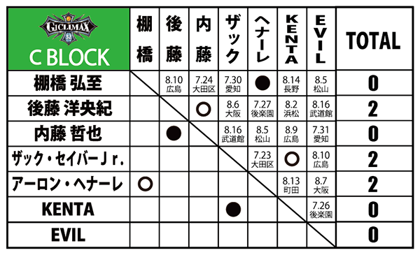 メインイベント(第9試合)はCブロック公式戦として、NEVER6人タッグ王者の後藤洋央紀と、内藤哲也が激突。内藤は緩急自在の攻撃で、後藤にダメージを蓄積させる。だが、後藤も荒々しい攻めで意地の反撃。終盤には変形の昇龍結界、地獄車、GTWと怒涛のたたみかけを見せる。しかし、内藤はGTRを切り抜けるとバレンティアを炸裂。そして一気にデスティーノを狙うも、回避した後藤は昇天・改をお見舞い。そして今度こそGTRを決め、内藤を見事討ち取った。