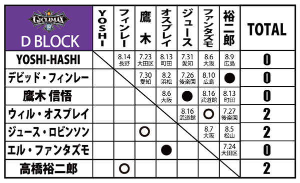 第6試合はDブロック公式戦、デビッド・フィンレーvs高橋裕二郎。念願の『G1』初出場となるフィンレーは、テクニックを駆使して果敢に攻める。だが、裕二郎も負けじと応戦。終盤、H.O.TのSHOが介入し、トーチャーツールでフィンレーを殴打。すかさず裕二郎はBig Juiceにつなぎ、3カウントを強奪した