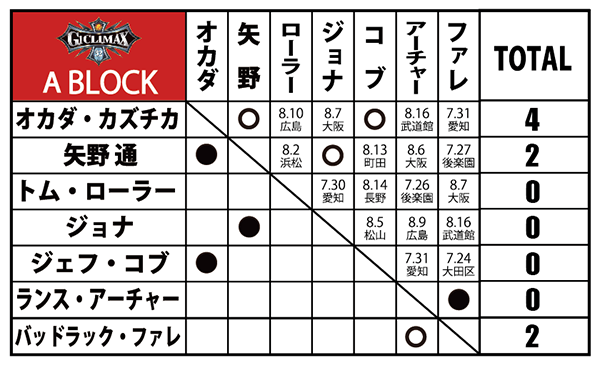 セミファイナル(第8試合)はAブロック公式戦、オカダ・カズチカ(1勝0敗)と矢野通(1勝0敗)によるCHAOS同門対決。いつものコミカルな顔を返上した矢野は、鬼の形相で厳しい攻めを見せ、終盤には鬼殺しを炸裂。さらに酒をオカダの顔面に噴射すると、丸め込みを連発し、3カウント寸前まで追い込む。しかし、『G1』二連覇を狙うオカダはピンチを切り抜けると、最後はマネークリップで勝利を収めた。