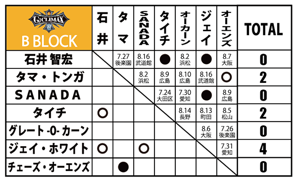 メインイベント(第9試合)はBブロック公式戦として石井智宏(0勝1敗)と、現IWGP世界ヘビー級王者ジェイ・ホワイト(1勝0敗)が激突。ジェイは序盤から外道の介入をはじめ、悪のインサイドワークで攻め立てる。だが、石井も意地を爆発。終盤、目まぐるしい技の読み合いから、ジェイに掟破りのSSSを食らわす。だが、垂直落下式ブレーンバスターを切り抜けたジェイは、一気にブレードランナーで石井を突き刺し、公式戦二連勝を飾った。