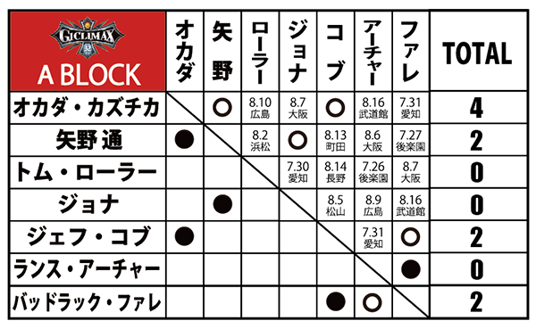 セミファイナル(第8試合)はAブロック公式戦、ジェフ・コブ(0勝1敗)vsバッドラック・ファレ(1勝0敗)。外国人実力者同士による注目の初対決は、体格で優るファレが重い攻撃で攻め込んでいく。だが、コブも真っ向から応戦し、終盤にはファレの巨体をブレーンバスターで叩きつける。続けてツアー・オブ・ジ・アイランドを見事に決め、コブが勝利をつかんだ。ファレ、コブ共に公式戦は1勝1敗。