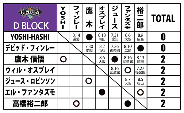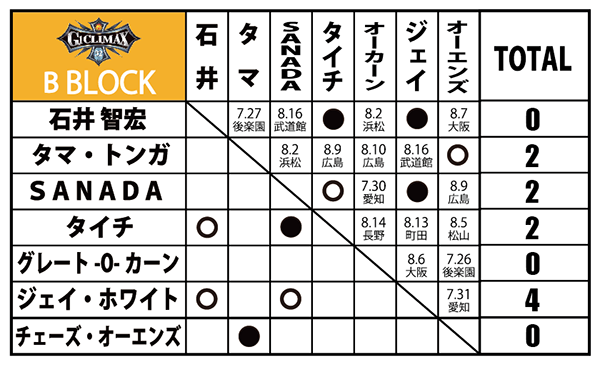 第7試合はBブロック公式戦で、SANADA(0勝1敗)とタイチ(1勝0敗)が対峙。元・全日本プロレス同士の両者は、往年の“四天王プロレス”を彷彿とさせる攻防を展開。終盤、タイチはSANADAの負傷箇所である左目に非情の攻撃。だが、横綱式カチ上げエルボーをかわしたSANADAが、オコーナーブリッジで逆転勝利。この結果、公式戦は共に1勝1敗。