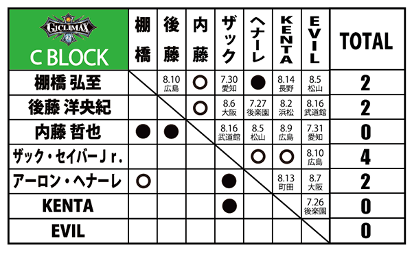 メインイベント(第9試合)はCブロック公式戦として棚橋弘至(0勝1敗)と、内藤哲也(0勝1敗)が激突。これまで幾度となく激闘を繰り広げてきた両雄は、序盤から重厚なレスリングでせめぎ合いを見せる。終盤、棚橋はハイフライフローを繰り出すが、かわした内藤は3月の『NEW JAPAN CUP』3回戦で勝利したように、ジャックナイフ式エビ固めを仕掛ける。だが、棚橋は意地のキックアウト。ならばと内藤はバレンティアからとどめのデスティーノを狙うも、棚橋は首固めで切り返し、執念の3カウントを奪取。これで棚橋は1勝1敗、内藤は悪夢の開幕2連敗に。