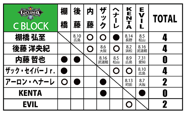 メインイベント(第9試合)はCブロック公式戦として、棚橋弘至(1勝1敗)とザック・セイバーJr.(2勝0敗)が激突。これまで『NEW JAPAN CUP』決勝やブリティッシュヘビー級王座戦など幾度となく激闘を繰り広げてきた両雄は、今回も意地を真っ向からぶつけ合う。ザックは矢継ぎ早にサブミッションを繰り出し、左腕を中心に攻め立てる。苦しい戦いとなった棚橋だが、終盤のザックドライバーをトゥエルブ・シックスに切り返す。そして、最後はザックの腕ひしぎ逆十字を回避すると巧みに丸め込み、執念の勝利。