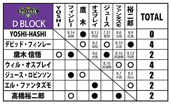 第6試合はDブロック公式戦としてデビッド・フィンレー(1勝1敗)と鷹木信悟(1勝1敗)が対決。鷹木の力強い攻撃に対し、フィンレーはスピードを活かして対抗。両者は一進一退の攻防を繰り広げる。終盤、鷹木は鷹木式GTRを狙うも、切り抜けたフィンレーは不意打ちのPrima Nocta。そこから流れるように丸め込むと、鷹木は返すことができず、フィンレーが価値ある勝利をつかんだ。