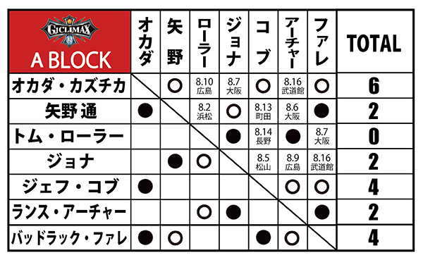 セミファイナル(第8試合)はAブロック公式戦、地元・愛知出身のオカダ・カズチカ(2勝0敗)がバッドラック・ファレ(2勝1敗)と対決。気合充分のオカダは、巨漢のファレ相手に真っ向勝負を挑む。ファレの重い攻撃に苦しむも、オカダはボディスラム、リバースネックブリーカーに成功。だが、レインメーカーの体勢に入るとファレはカウンターのグラネードを炸裂。さらにファレは正調のグラネードを決め、とどめのバッドラックフォールへ。しかし、オカダは回避すると、変形ネックブリーカーからマネークリップで絞め上げ、怪物退治に成功した。