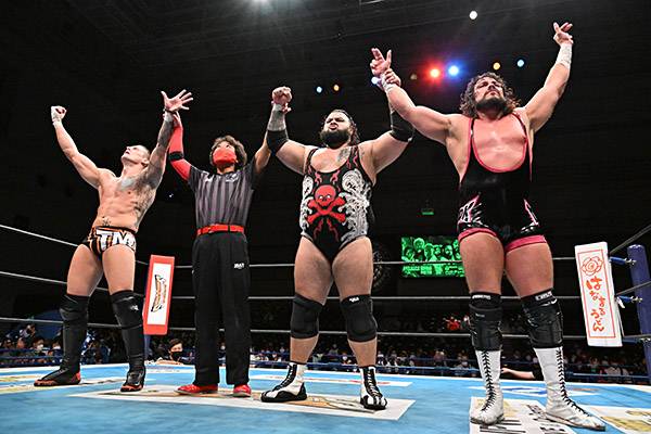 第3試合は9.25神戸大会でIWGPジュニアタッグ選手権試合を控えている挑戦者組の田口隆祐&マスター・ワトの6or9と、王者組のTJP&フランシスコ・アキラの前哨戦。それぞれ邪道とアーロン・ヘナーレを引き連れ、6人タッグマッチで対戦した。6or9もTJP&アキラも、お互いに華麗な連携攻撃を繰り出して一歩も譲らず。しかし、一人だけ入っていたヘビー級のヘナーレが圧倒的なパワーを見せつけ、邪道をアルティマで始末してみせた。