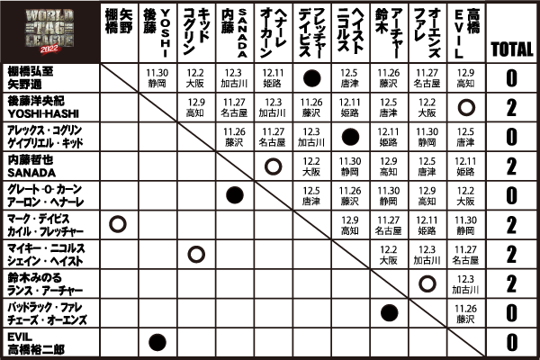 第6試合の『WTL』公式戦は、毘沙門(後藤洋央紀&YOSHI-HASHI)vsEVIL&高橋裕二郎。昨年の『WTL』優勝決定戦と同一カードが初戦で実現。新テーマ曲に新コスチュームの毘沙門は、気合十分のファイトを見せるも、H.O.Tは無法ファイトで応戦。終盤、東郷やSHOが乱入するが、YOH&リオ・ラッシュが救出に登場。大乱戦の中、最後は毘沙門が裕二郎に激烈一閃から消灯を炸裂。2連覇に向けて好スタートを切った。