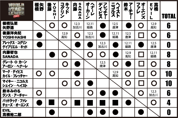 12月2日(金)、大阪・大阪市中央体育館・サブアリーナ(丸善インテックアリーナ大阪)で『WORLD TAG LEAGUE 2022 & SUPER Jr. TAG LEAGUE 2022』第9戦が開催された。今大会では『WTL』の公式リーグ戦(全9試合の5戦目)が4試合、『SJTL』の公式リーグ戦(全9試合の6戦目)が5試合、行なわれた。
