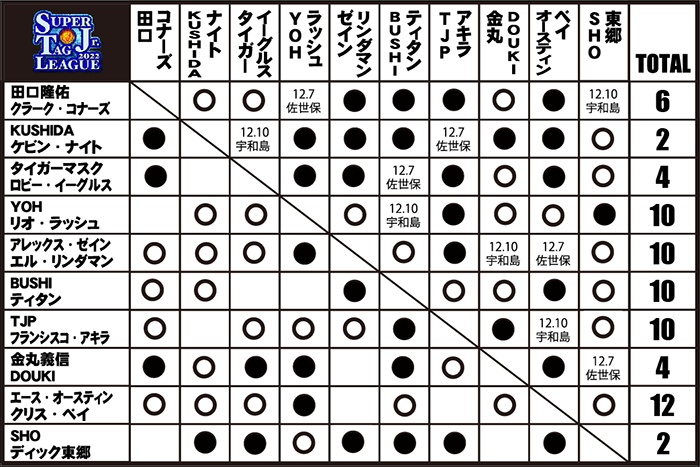 これらの結果、『SJTL』はオースティン&ベイが勝ち点12で単独1位となり、そのあとを勝ち点10のCatch 2/2、BUSHI&ティタン、ゼイン&リンダマン、YOH&ラッシュの4チームが猛追する熾烈な展開となった。