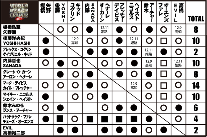 12月5日(月)、佐賀・唐津市文化体育館で『WORLD TAG LEAGUE 2022 & SUPER Jr. TAG LEAGUE 2022』第12戦が開催された。今大会では『WTL』の公式リーグ戦(全9試合の7戦目)を中心に激闘が繰り広げられた。現時点では6勝1敗で単独首位のオージー・オープンを、5勝1敗のTMDKと5勝2敗の内藤&SANADAが追いかける展開に。