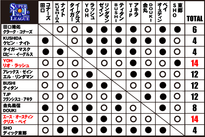 ※リーグ戦終了時に「14点」を獲得したYOH&リオ・ラッシュ、エース・オースティン&クリス・ベイが12月14日(水) 仙台サンプラザホールの『SUPER Jr. TAG LEAGUE 2022』優勝決定戦に進出。