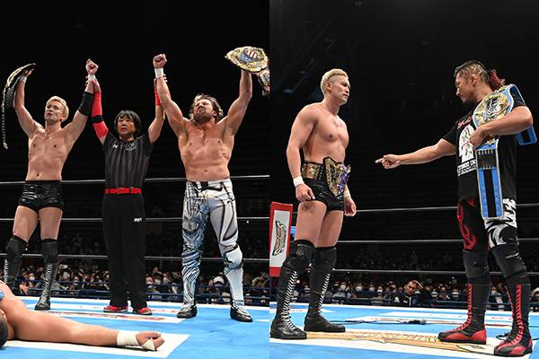 メイン(第7試合)では、かつての好敵手同士であるIWGP世界ヘビー級王者のオカダ・カズチカとIWGP USヘビー級王者のケニー・オメガが“初夢タッグ”を結成し、ジェフ・コブ&アーロン・ヘナーレ組と対決。UNITED EMPIREは王者コンビにひるむことなく、パワフルな攻めで追い込んでいく。だが王者タッグも徹底抗戦。終盤、UNITED EMPIREはオカダに波状攻撃を仕掛け、ヘナーレがStreets of Rageを狙う。だが、オカダは切り抜け、ケニーと息の合った連携でまずはコブを排除。そして孤立したヘナーレに、ショートレンジラリアット&Vトリガーの合体技を炸裂。最後はオカダがレインメーカーでヘナーレを撃沈し、勝利を飾った。