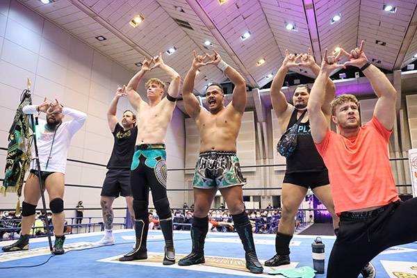 第4試合は後藤洋央紀&石井智宏&矢野通&本間朋晃vsウィル・オスプレイ&マーク・デイビス&ジェフ・コブ&グレート-O-カーン。試合中、3.13愛媛の『NJC』2回戦で同門対決を行なうオスプレイとデイビスのあいだに、誤爆をきっかけに不穏な空気が漂う場面も。しかし、コブがツアー・オブ・ジ・アイランドで本間を沈めると、試合後にオスプレイとデイビスは握手をかわし、和解した。