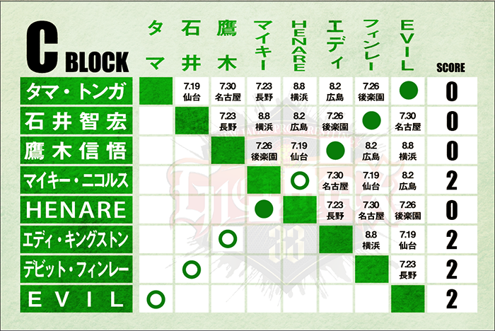 セミ(第7試合)はCブロック公式戦、過去の遺恨を引きずるタマ・トンガとEVILが対峙。EVILはゴングを待たずに仕掛けると、その後もダーティーファイトで蹂躙。だが、タマも意地の猛反撃。終盤にはディック東郷をガンスタンで排除し、EVILにもガンスタンを狙う。だが、EVILはレフェリーのスキをついてタマにローブローを叩き込むと、EVILを炸裂し勝利を強奪した。