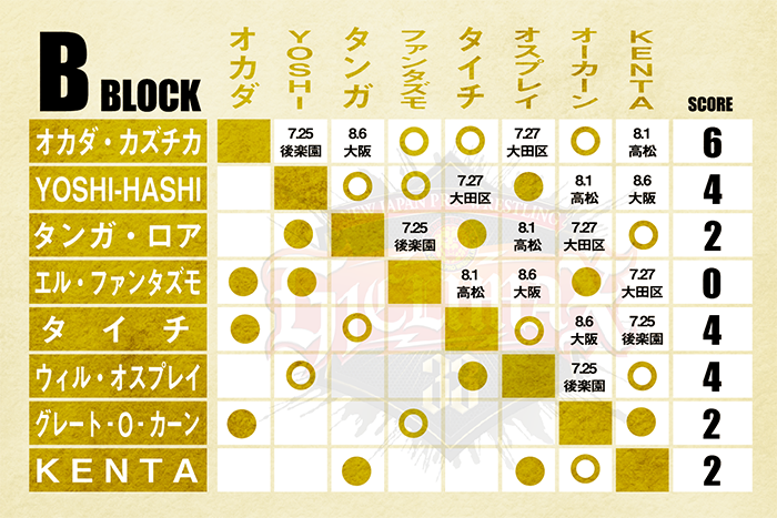 セミ(第7試合)はBブロック公式戦、3連覇を狙うオカダ・カズチカ(2勝0敗)がKOPW保持者のタイチ(2勝0敗)と対決。タイチに顔面を蹴り抜かれたオカダは、鬼気迫る攻撃で猛反撃。しかし、タイチはひるまず応戦。終盤には怒涛のたたみかけを見せ、タイチ式外道クラッチで3カウント寸前まで追い込む。だが、最後はオカダがタイチ式ラストライドをエビ固めで切り返し、接戦を制した。