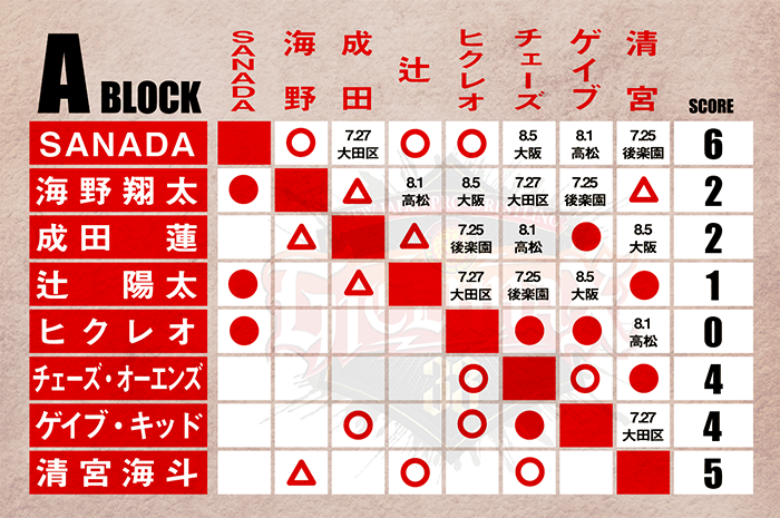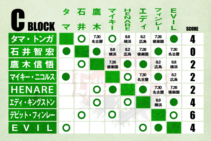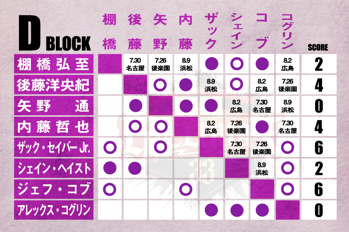 この結果、Cブロックはフィンレー(3勝0敗)が単独首位。Dブロックはコブとザックが共に負けなしの3連勝で首位を併走。両ブロックの4戦目は7.26後楽園で行なわれる。