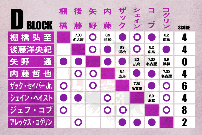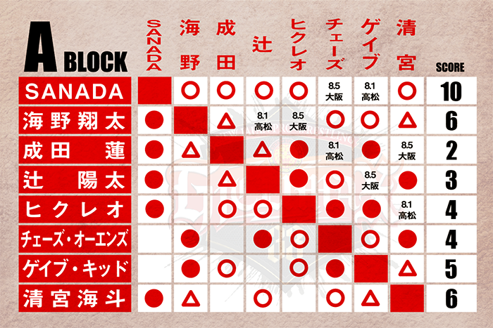 この結果、AブロックはSANADAが変わらず単独首位をキープ。そのあとを清宮と、浮上してきた海野が2位タイで追う展開に。Bブロックはオカダとオスプレイが首位タイで並び、タイチが3位で追走。両ブロックの6戦目は8.1高松で行なわれる。