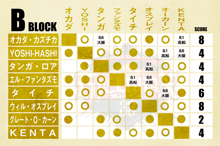 現在、Aブロックは4勝0敗のSANADAが首位を独走。そのあとを2位の清宮海斗(2勝1敗1分)が追いかける展開に。Bブロックも4勝0敗のオカダ・カズチカが1位で独走状態。それをウィル・オスプレイ(3勝1敗)が2位でピタリとマークしている。