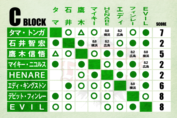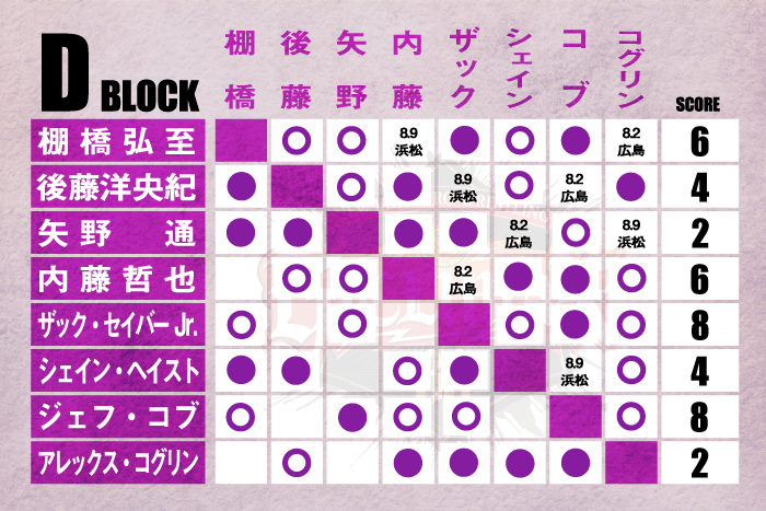 この結果、CブロックはフィンレーとEVILが首位をキープし、タマは2位に後退。Dブロックはコブとザックが再び首位タイとなり、そのあとを棚橋と内藤が追う展開に。両ブロックの6戦目は8.2広島で行なわれる。