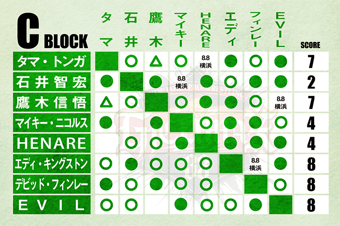 第4試合は8.8横浜のCブロック公式戦で雌雄を決するエディ・キングストンとデビッド・フィンレーが、それぞれ真壁刀義、チェーズ・オーエンズをパートナーに前哨対決。フィンレーとオーエンズのラフ&テクニックに対し、キングストンと真壁は力強いファイトで対抗。終盤、オーエンズがキングストンをCトリガーで排除すると、最後はフィンレーがINTO OBLIVIONで孤立した真壁を撃沈。試合後、フィンレーとキングストンは静かににらみあった。