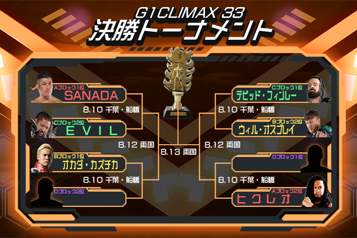 今大会の結果を受けて、8.10船橋の準々決勝ではCブロック1位のフィンレーがBブロック2位のオスプレイと対戦。そしてCブロック2位のEVILは、Aブロック1位のSANADAと激突することが決定した。