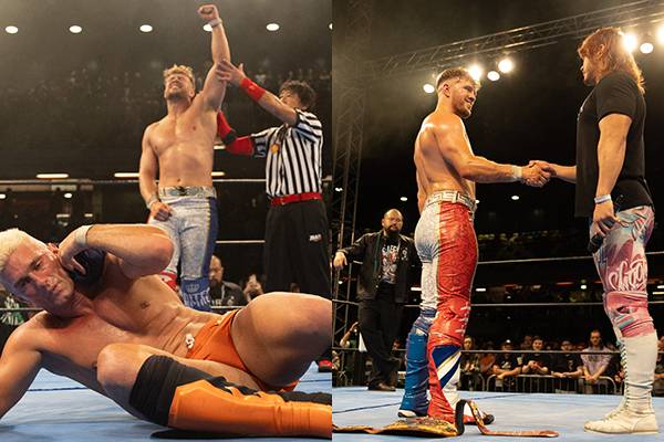 メインイベント(第10試合)はIWGP US(UK)ヘビー級王者のウィル・オスプレイとNJPW WORLD認定TV王者のザック・セイバーJr.が、“UK”のベルトを懸けて激突。これまでも幾度となく激闘を繰り広げてきた両雄の王座戦は、“イギリス人頂上対決”にふさわしいハイレベルな技術の応酬に。終盤、オスプレイはストームブレイカーを炸裂するが、なんとザックはカバーをカウント2でキックアウト。そしてコーナー最上段からの飛びつき腕ひしぎ逆十字、ザックドライバーと怒涛の反撃。だが最後はオスプレイが執念のストームブレイカーで、2度目の防衛に成功した。
