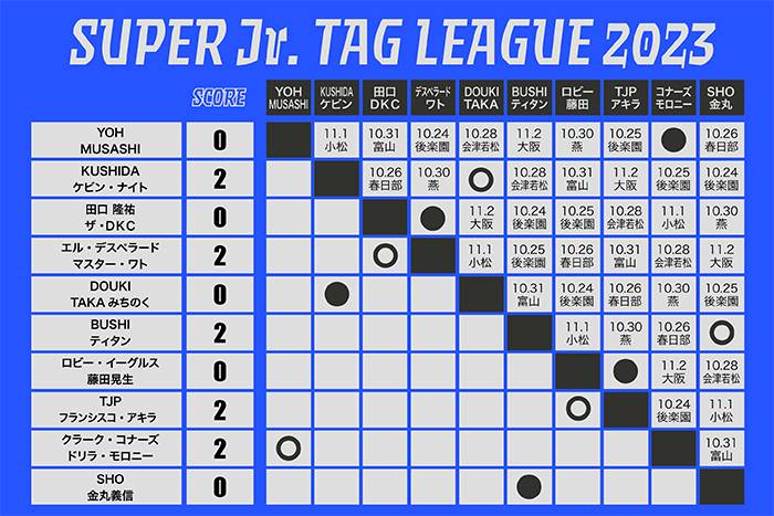 第7試合の『SJTL』公式戦はYOH&MUSASHI(みちのくプロレス)組が、現IWGPジュニアタッグ王者のクラーク・コナーズ&ドリラ・モロニー組と対決。越境コンビとなるYOH&MUSASHIさまざまな連携を繰り出し、新崎人生ばりの拝み渡りまで披露。だが、王者組もパワーファイトを軸に対抗。最後は孤立したYOHを、Full Clipで豪快に葬った。