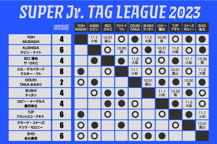 10月28日(土)、福島・鶴ヶ城体育館で『カンタン酢™ Presents SUPER Jr. TAG LEAGUE 2023 ~Road to POWER STRUGGLE ~』第5戦が行なわれ、公式戦5試合(全9戦の5戦目)を中心に激闘が繰り広げられた。現時点では4チームが首位タイ(3勝1敗)で並んでいる。