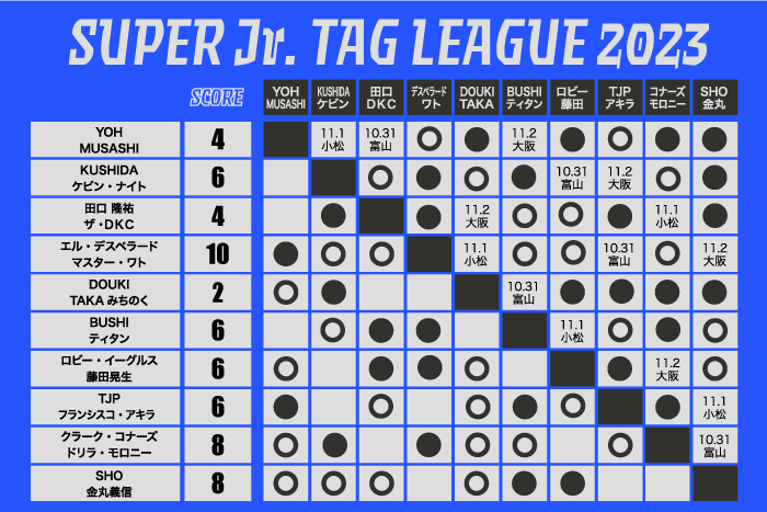これらの公式戦の結果、デスペラード&ワト組が5勝1敗で単独首位。そのあとを4勝2敗のコナーズ&モロニー組、SHO&金丸組が追走。残す公式戦はあと三つとなった。