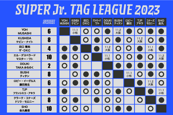現時点ではエル・デスペラード&マスター・ワト組が単独首位(5勝1敗)をキープ。そのあとをクラーク・コナーズ&ドリラ・モロニー組とSHO&金丸義信組が4勝2敗で追いかける展開に。