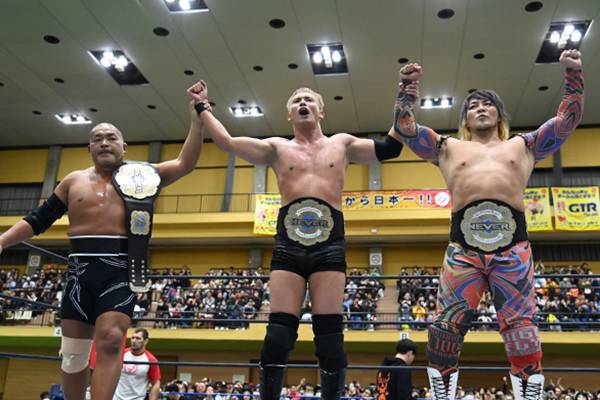 このチャンスに誰よりも燃えたのは、凱旋帰国後初のタイトル挑戦となった上村だ。しかし、その上村を相手にしないような素振りを見せていたオカダだったが、試合中に突っかけられて激怒。上村を客席に放り込むような荒々しい姿まで見せた。だが、Just 5 Guysも抜群の連携で対抗。上村もオカダに得意の閂スープレックスを決めてみせるなど、あわやというところまで追い込んだ。